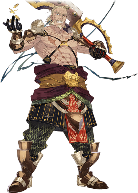 Angriff is a broadminded, aged mercenary. He is also known as Angriff the Immortal (不死身のアングリフ). He wanders from place to place, slaying a multitude of monsters. He also visits many bars in search of delicious alcohol, which he is very fond of.